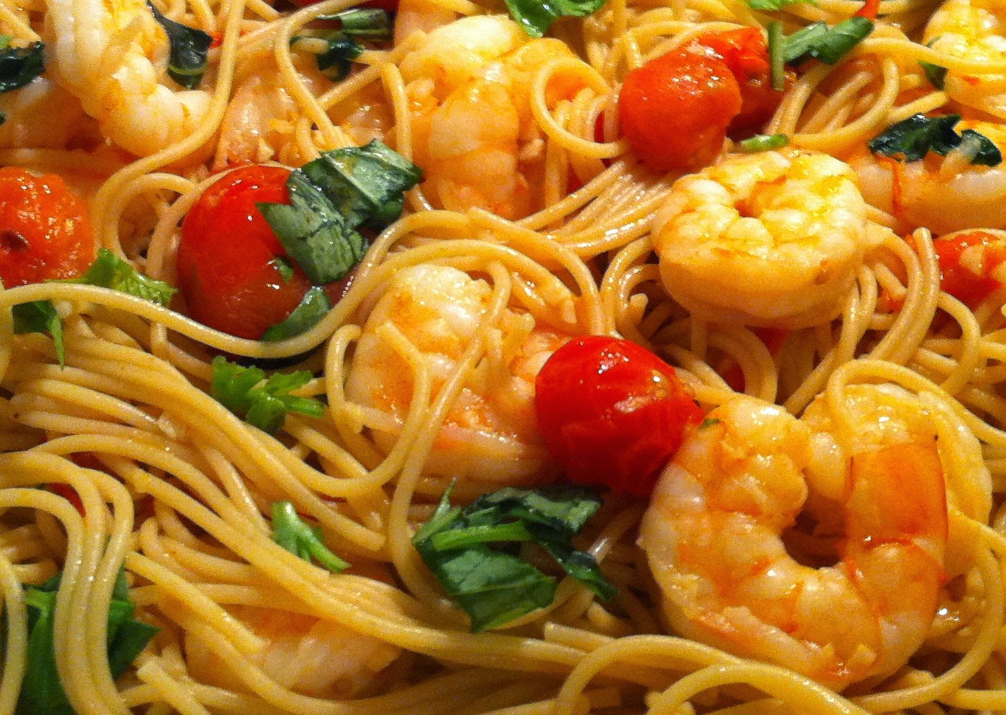 Add pasta to pan with shrimp and tomatoes. Add some of the water, if necessary, to loosen the sauce.