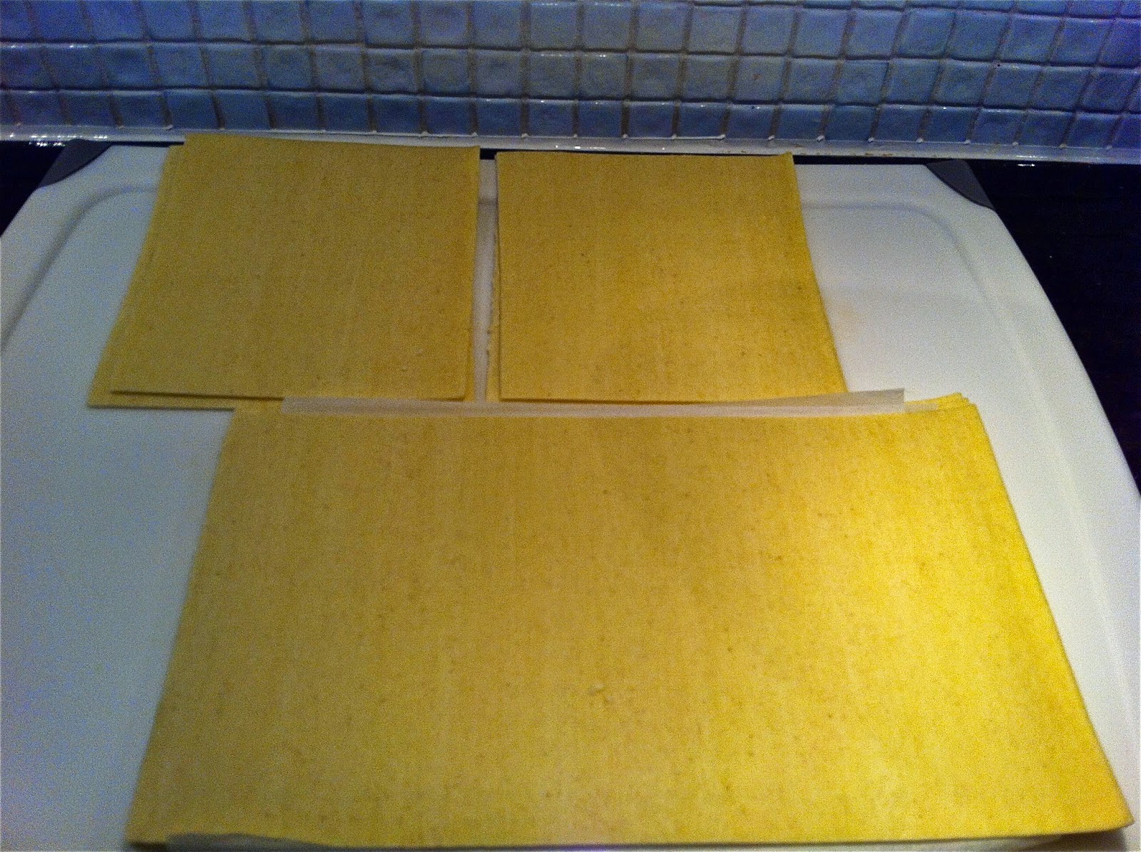 Using a regular sized ice-cream scoop, place a leveled scoop of the filling onto each 1/2 sheet of pasta.